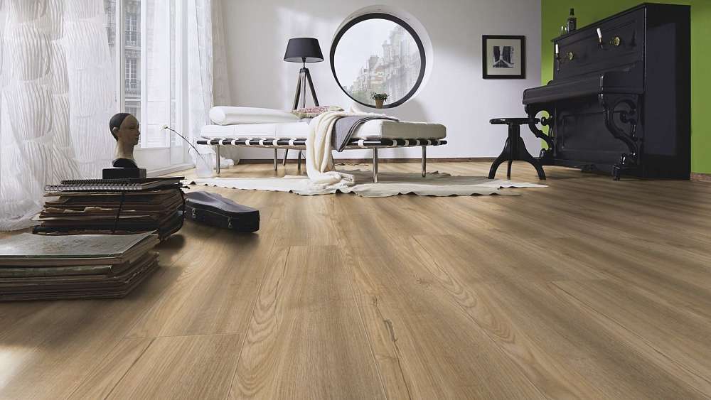 Это полностью готовое покрытие. Оно не требует финишной отделки – верхний слой с "Однополосный" рисунком прекрасно вписывается в любое оформление комнаты и хорошо смотрится со всеми настенными и потолочными материалами. Толщина доски составляет 12мм, что позволяет сделать пол прочным, устойчивым к прогибу. Ламинированная панель выдерживает большой вес мебели, на ней не остается следов от ножек и царапин. Материал хорошо держит тепло внутри помещения, не пропускает внутрь холод.